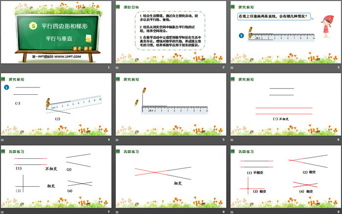 关键词:人教版四年级上册数学PPT课件免费下载,平行与垂直PPT下载,平行四边形和梯形PPT下载,.PPT格式;