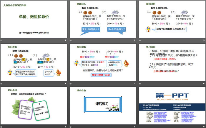 关键词:人教版四年级上册数学PPT课件免费下载,单价数量和总价PPT下载,三位数乘两位数PPT下载,.PPT格式;