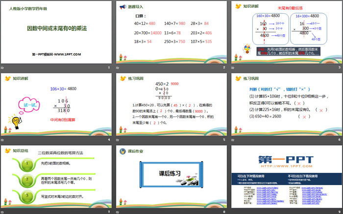 关键词:人教版四年级上册数学PPT课件免费下载,因数中间或末尾有0的乘法PPT下载,三位数乘两位数PPT下载,.PPT格式;