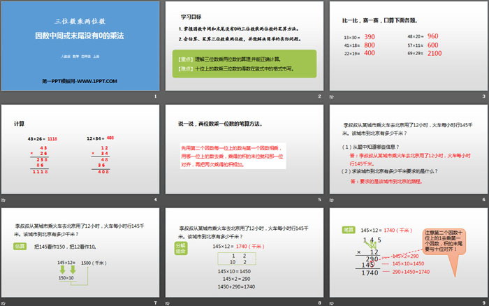 关键词:人教版四年级上册数学PPT课件免费下载,因数中间或末尾没有0的乘法PPT下载,三位数乘两位数PPT下载,.PPT格式;