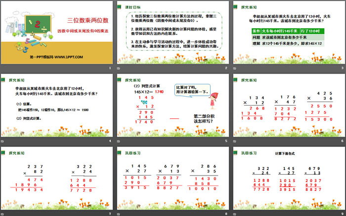 关键词:人教版四年级上册数学PPT课件免费下载,因数中间或末尾没有0的乘法PPT下载,三位数乘两位数PPT下载,.PPT格式;