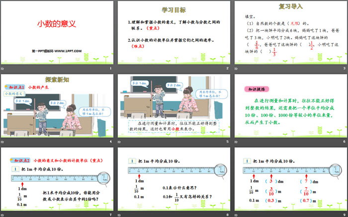 1.在进行测量和计算时,往往不能正好得到整数的结果,还需要把一个单位平均分成 10 份、100 份、1000 份等较小的单位来量,从而产生了小数。