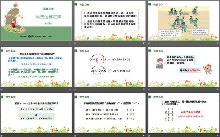 1.通过探索乘法分配律的活动,进一步体验探索规律的过程,并能用字母表示发现的规律。