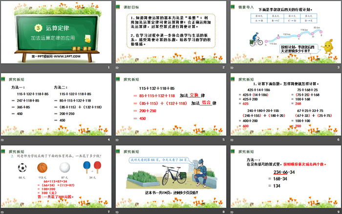 关键词:人教版四年级下册数学PPT课件免费下载,加法运算定律的应用PPT下载,运算定律PPT下载,.PPT格式;