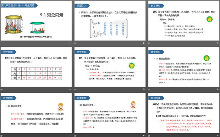 关键词:人教版四年级下册数学PPT课件免费下载,数学广角PPT下载,鸡兔同笼PPT下载,.PPT格式;
