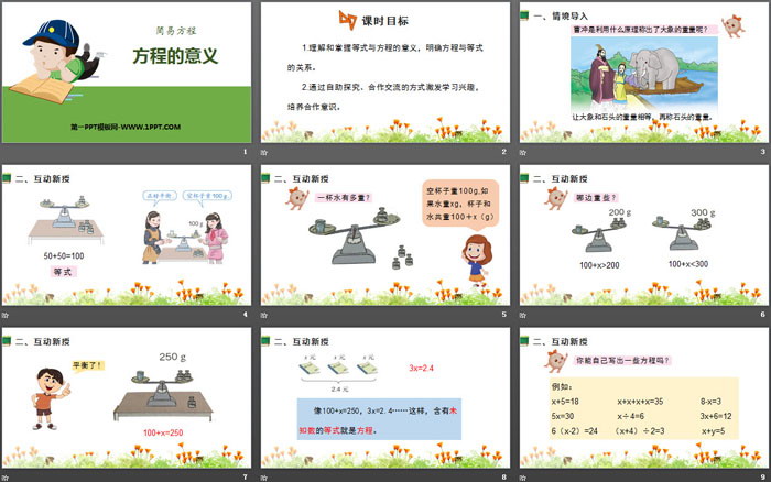 关键词:人教版五年级上册数学PPT课件免费下载,方程的意义PPT下载,简易方程PPT下载,.PPT格式;
