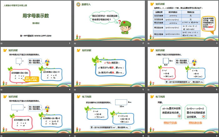 关键词:人教版五年级上册数学PPT课件免费下载,用字母表示数PPT下载,简易方程PPT下载,.PPT格式;