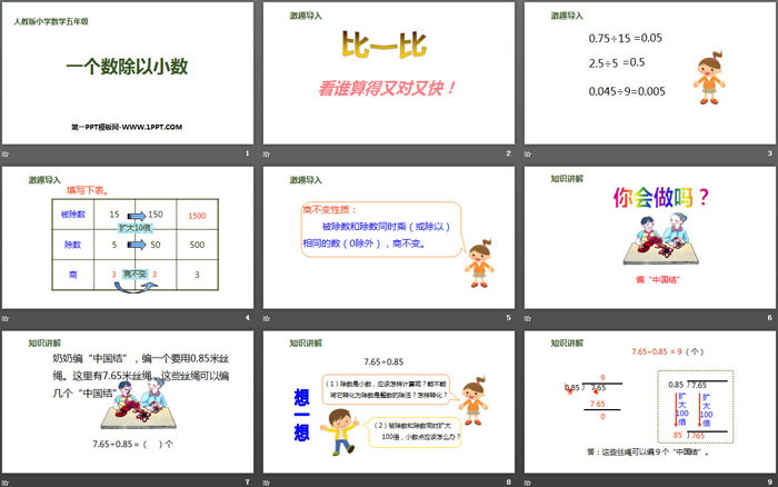 关键词:人教版五年级上册数学PPT课件免费下载,一个数除以小数PPT下载,小数除法PPT下载,.PPT格式;