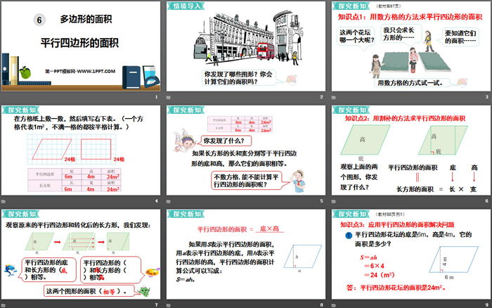 关键词:人教版五年级上册数学PPT课件免费下载,平行四边形的面积PPT下载,多边形的面积PPT下载,.PPT格式;
