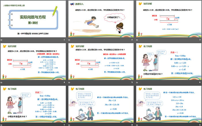 关键词:人教版五年级上册数学PPT课件免费下载,实际问题与方程PPT下载,简易方程PPT下载,.PPT格式;