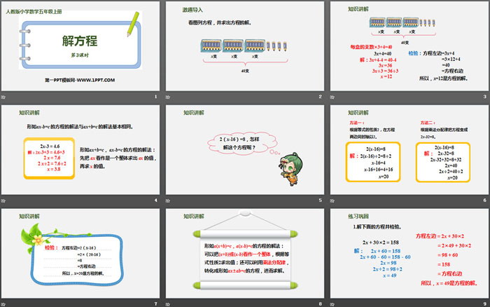 关键词:人教版五年级上册数学PPT课件免费下载,解方程PPT下载,简易方程PPT下载,.PPT格式;