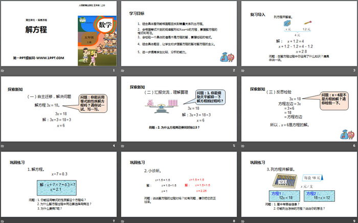 关键词:人教版五年级上册数学PPT课件免费下载,解方程PPT下载,简易方程PPT下载,.PPT格式;