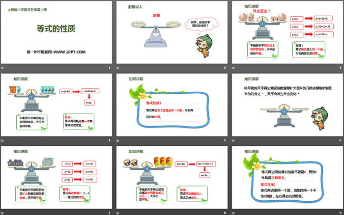 关键词:人教版五年级上册数学PPT课件免费下载,等式的性质PPT下载,简易方程PPT下载,.PPT格式;