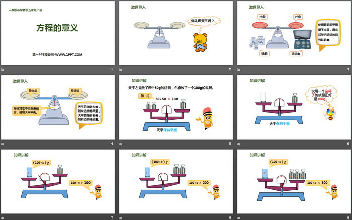 关键词:人教版五年级上册数学PPT课件免费下载,方程的意义PPT下载,简易方程PPT下载,.PPT格式;