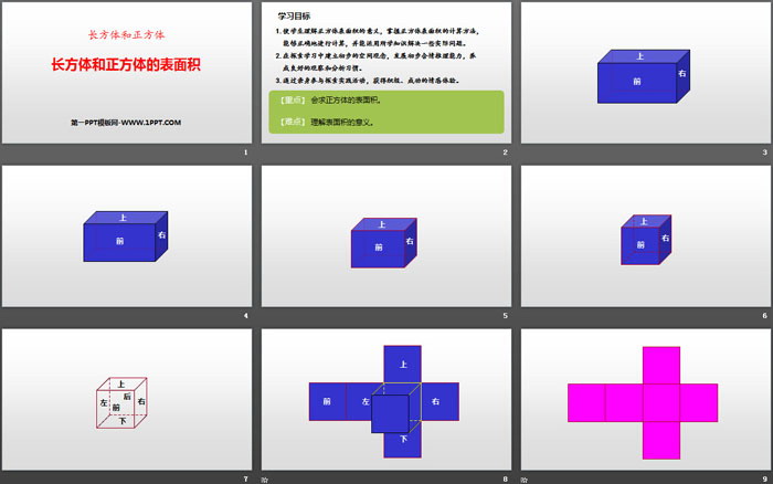 关键词:人教版五年级下册数学PPT课件免费下载,长方体和正方体的表面积PPT下载,长方体和正方体PPT下载,.PPT格式;