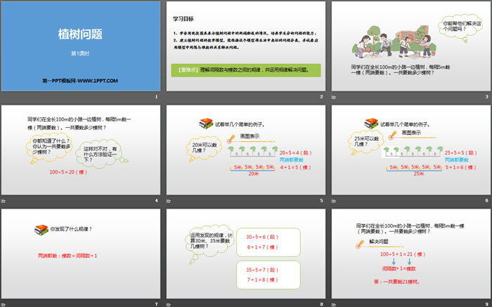关键词:人教版五年级上册数学PPT课件免费下载,植树问题PPT下载,数学广角PPT下载,.PPT格式;