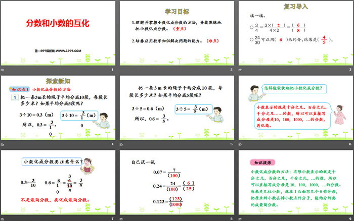 1.理解并掌握小数化成分数的方法,并能熟练地把小数化成分数。(重点)