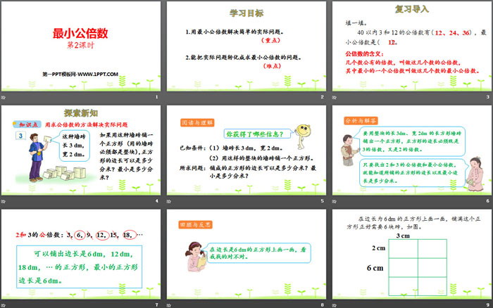 只要找出 2 和 3 的公倍数和最小公倍数,就能知道所铺的正方形的边长以及最小边长是多少分米。