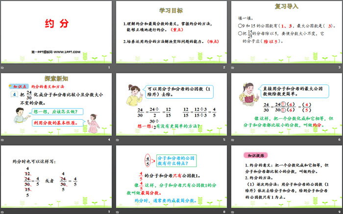 关键词:人教版五年级下册数学PPT课件免费下载,约分PPT下载,分数的意义和性质PPT下载,.PPT格式;