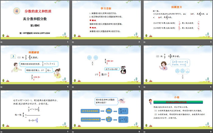 关键词:人教版五年级下册数学PPT课件免费下载,真分数和假分数PPT下载,分数的意义和性质PPT下载,.PPT格式;