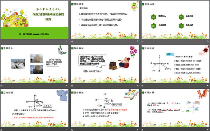 关键词:人教版六年级上册数学PPT课件免费下载,根据方向和距离描述点的位置PPT下载,位置与方向PPT下载,.PPT格式;