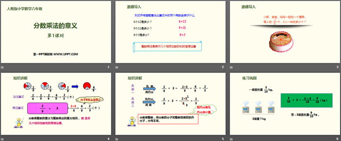 关键词:人教版六年级上册数学PPT课件免费下载,分数乘法的意义PPT下载,分数乘法PPT下载,.PPT格式;