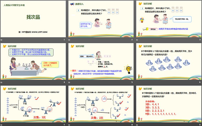 关键词:人教版五年级下册数学PPT课件免费下载,找次品PPT下载,数学广角PPT下载,.PPT格式;