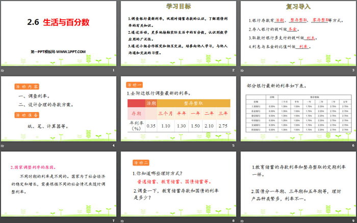 1.调查银行最新利率,巩固对储蓄存款的认识,了解国债利率的有关知识。