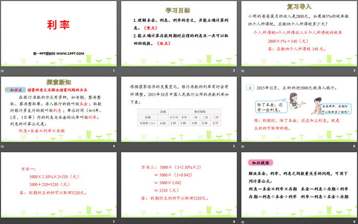 关键词:人教版六年级下册数学PPT课件免费下载,利率PPT下载,百分数PPT下载,.PPT格式;
