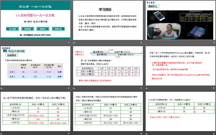 1. 体会分类思想和方程思想在解决问题中的作用,能够根据已知条件选择分类关键点对“电话计费问题”进行整体分析,从而得出整体选择方案. (重点、难点)