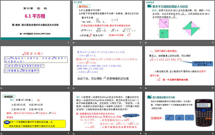 关键词:人教版七年级下册数学PPT课件免费下载,平方根PPT下载,实数PPT下载,用计算器求算术平方根及其大小比较PPT下载,.PPT格式;