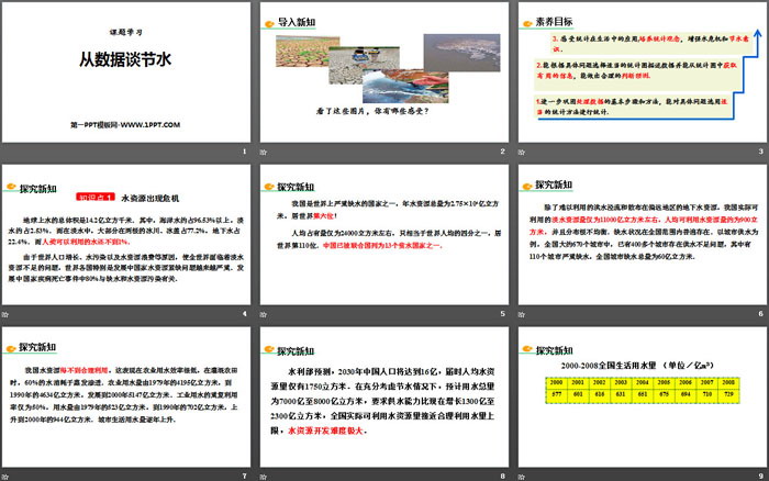 关键词:人教版七年级下册数学PPT课件免费下载,从数据谈节水PPT下载,数据的收集整理与描述PPT下载,.PPT格式;