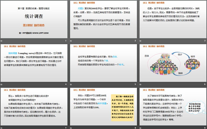 关键词:人教版七年级下册数学PPT课件免费下载,统计调查PPT下载,数据的收集整理与描述PPT下载,抽样调查PPT下载,.PPT格式;