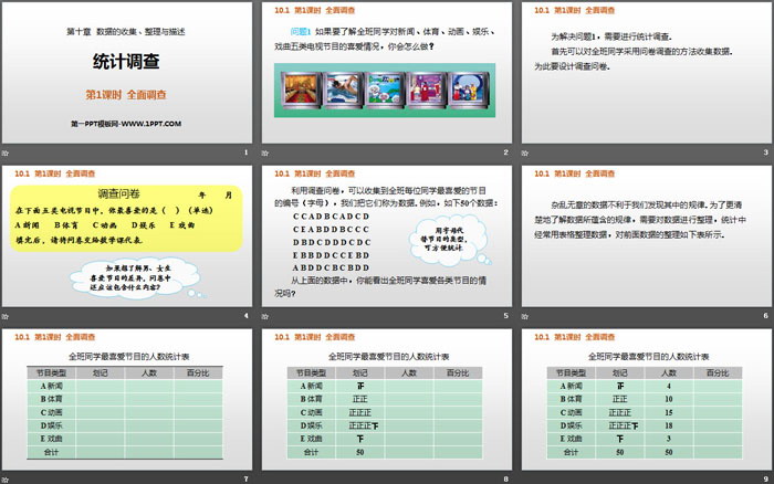 关键词:人教版七年级下册数学PPT课件免费下载,统计调查PPT下载,数据的收集整理与描述PPT下载,全面调查PPT下载,.PPT格式;
