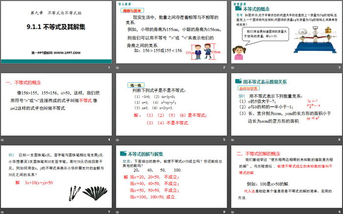 关键词:人教版七年级下册数学PPT课件免费下载,不等式及其解集PPT下载,不等式与不等式组PPT下载,.PPT格式;