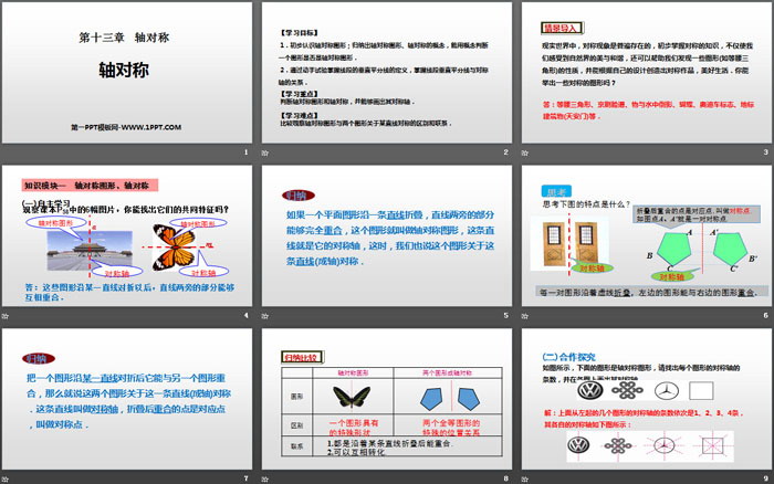 1.初步认识轴对称图形;归纳出轴对称图形、轴对称的概念,能用概念判断一个图形是否是轴对称图形.