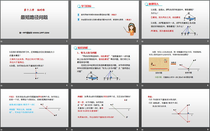 关键词:人教版八年级上册数学PPT课件免费下载,最短路径问题PPT下载,轴对称PPT下载,.PPT格式;