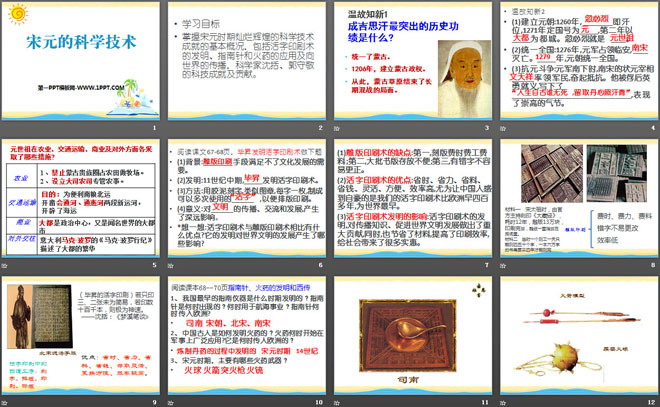 掌握宋元时期灿烂辉煌的科学技术成就的基本概况,包括活字印刷术的发明、指南针和火药的应用及向世界的传播,科学家沈括、郭守敬的科技成就及贡献。