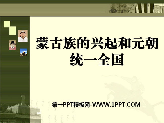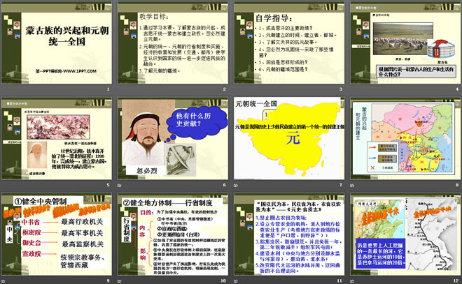 1.通过学习本课,了解蒙古族的兴起、成吉思汗统一蒙古和建立政权。忽必烈建立元朝。