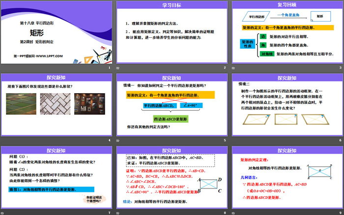 关键词:人教版八年级下册数学PPT课件免费下载,矩形PPT下载,平行四边形PPT下载,矩形的判定PPT下载,.PPT格式;