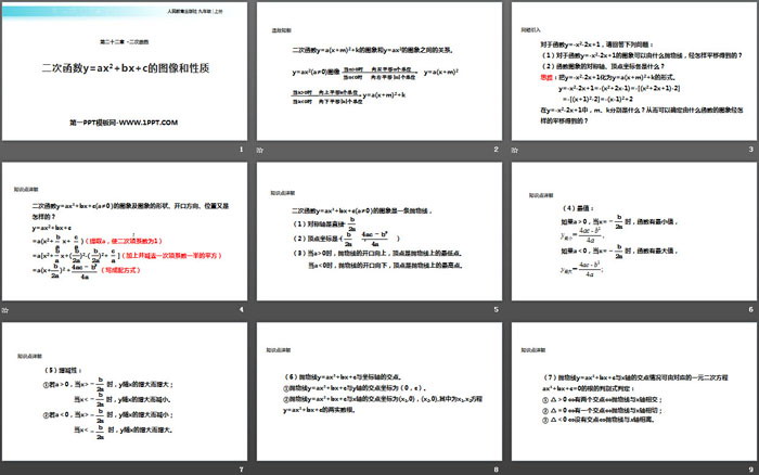 关键词:人教版九年级上册数学PPT课件免费下载,二次函数y=ax2+bx+c的图像和性质PPT下载,二次函数PPT下载,.PPT格式;