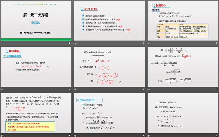 关键词:人教版九年级上册数学PPT课件免费下载,解一元二次方程PPT下载,一元二次方程PPT下载,公式法PPT下载,.PPT格式;