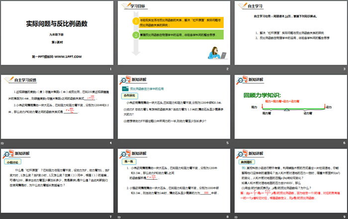 体验现实生活与反比例函数的关系,解决“杠杆原理”实际问题与反比例函数关系的探究;
