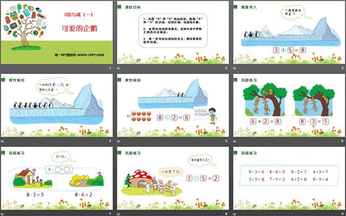 关键词:北师大版一年级上册数学PPT课件免费下载,可爱的企鹅PPT下载,加与减PPT下载,.PPT格式;