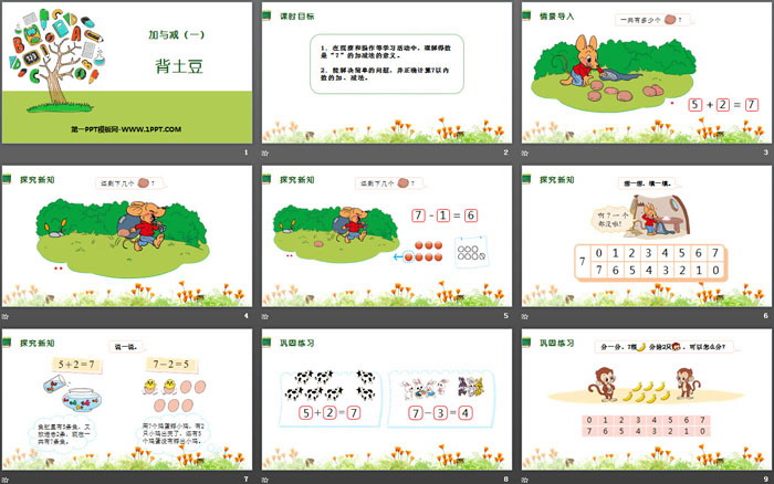 关键词:北师大版一年级上册数学PPT课件免费下载,背土豆PPT下载,加与减PPT下载,.PPT格式;