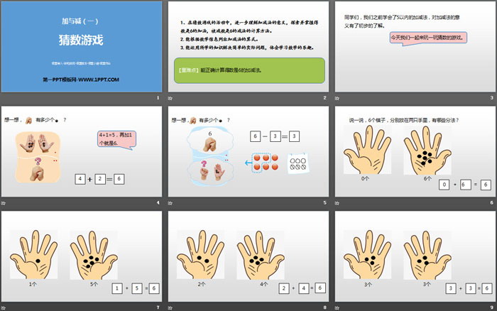1.在猜数游戏的活动中,进一步理解加减法的意义,探索并掌握得数是6的加法,被减数是6的减法的计算方法。