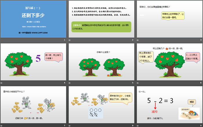关键词:北师大版一年级上册数学PPT课件免费下载,还剩下多少PPT下载,加与减PPT下载,认识减法PPT下载,.PPT格式;