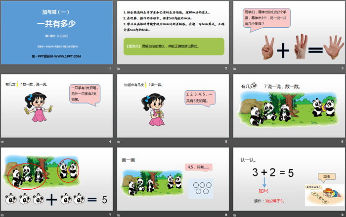 关键词:北师大版一年级上册数学PPT课件免费下载,一共有多少PPT下载,加与减PPT下载,认识加法PPT下载,.PPT格式;