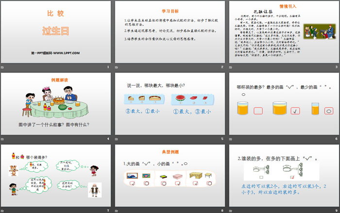 关键词:北师大版一年级上册数学PPT课件免费下载,过生日PPT下载,比较PPT下载,.PPT格式;