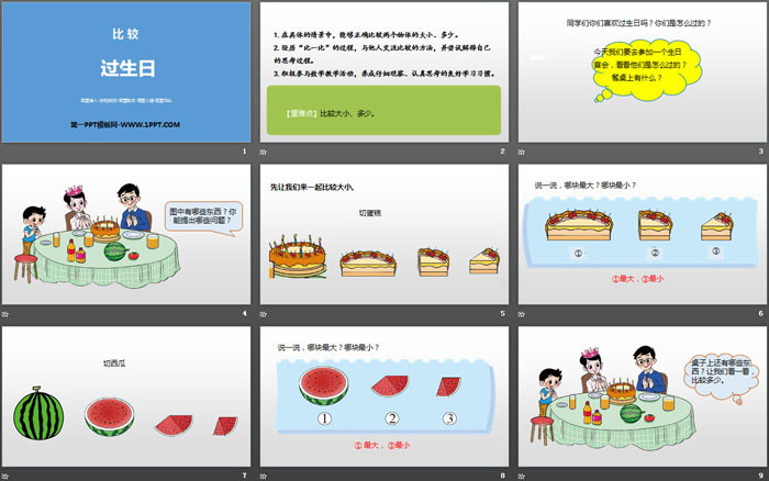 关键词:北师大版一年级上册数学PPT课件免费下载,过生日PPT下载,比较PPT下载,.PPT格式;